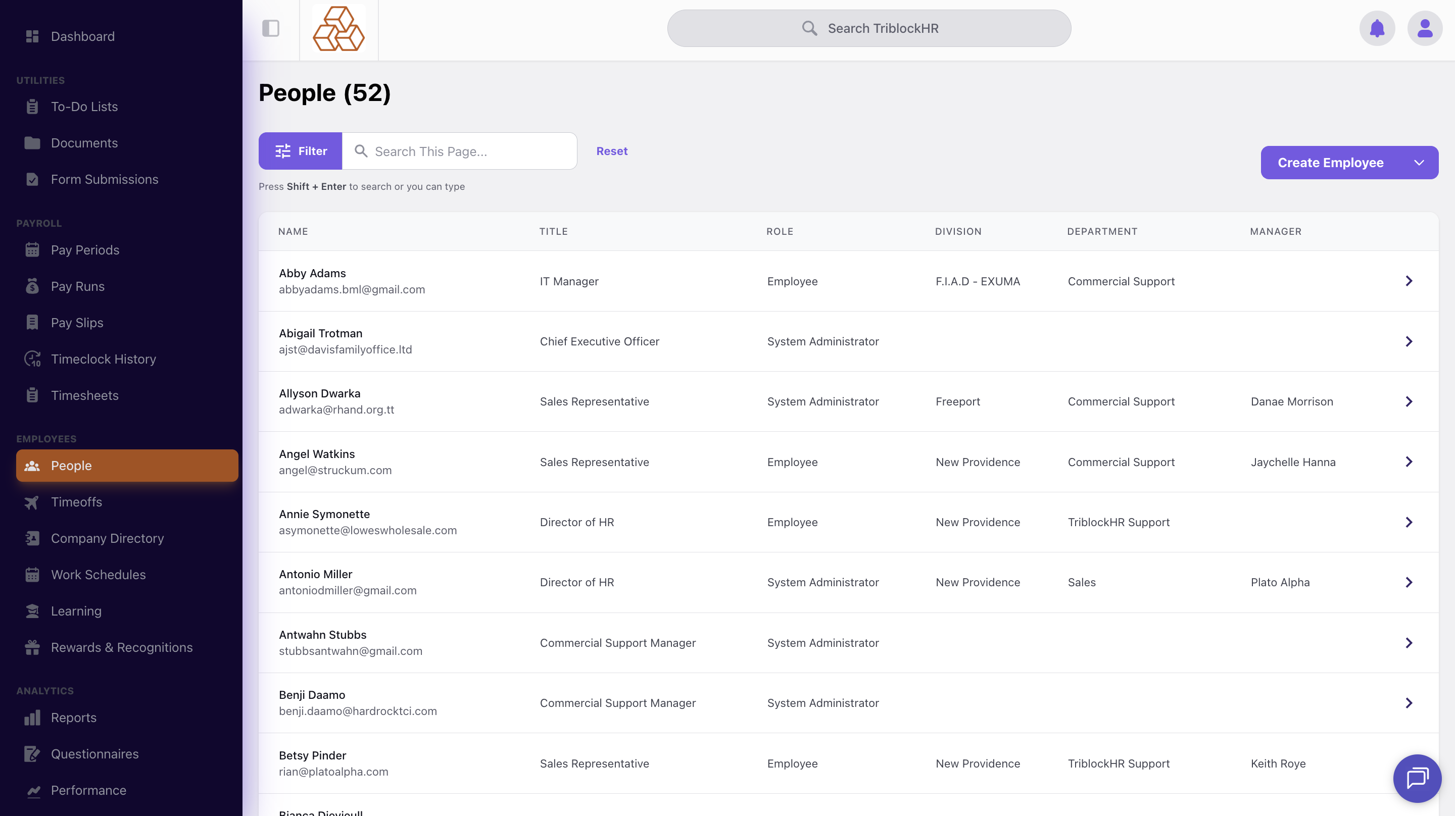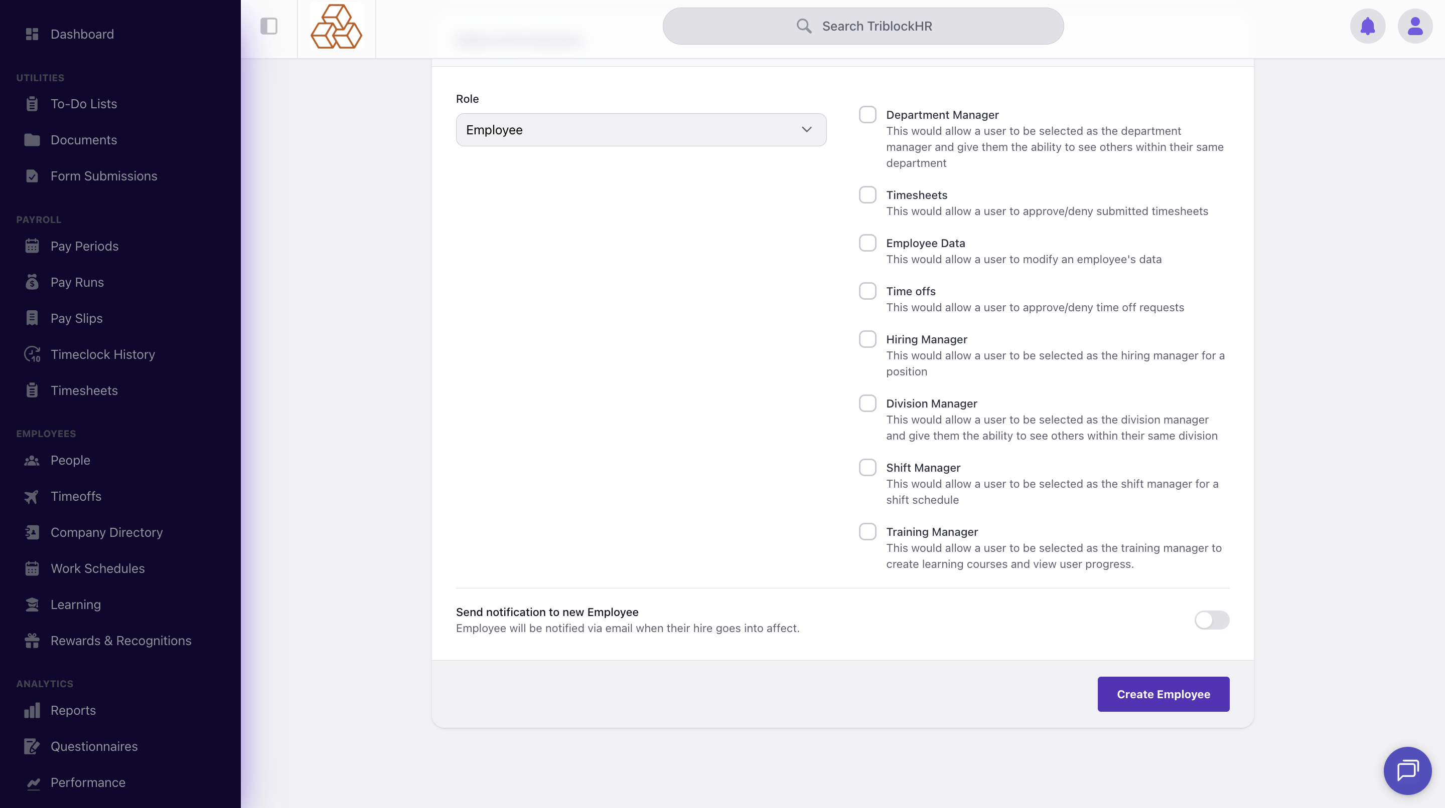 To create a new employee, first go to the People's module, and click on the Create Employee button.